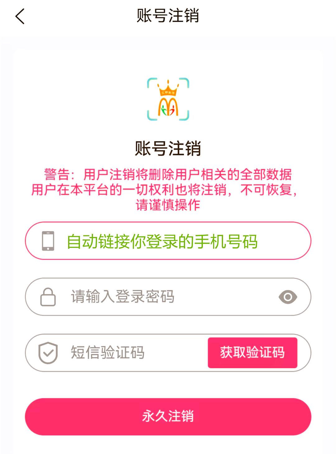 自动链接你登录的手机号码--请输入登录密码--点击获取验证码—输入短信验证码—点击永久注销